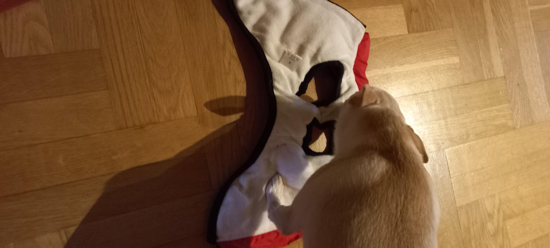A hám a kabáthoz van rögzítve így egy belebújással könnyen feladhatod kutyusodra.